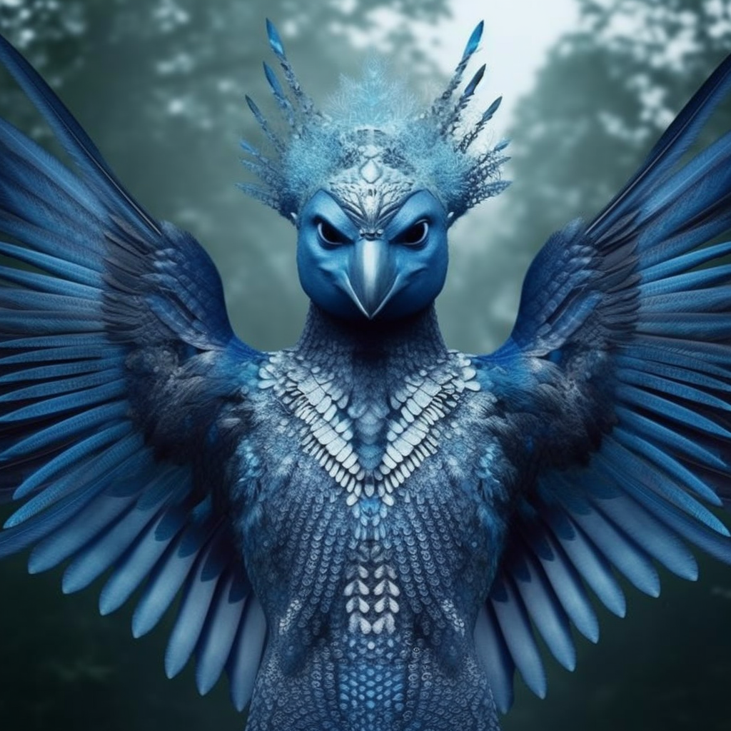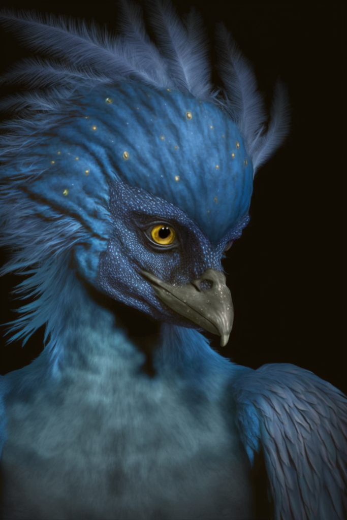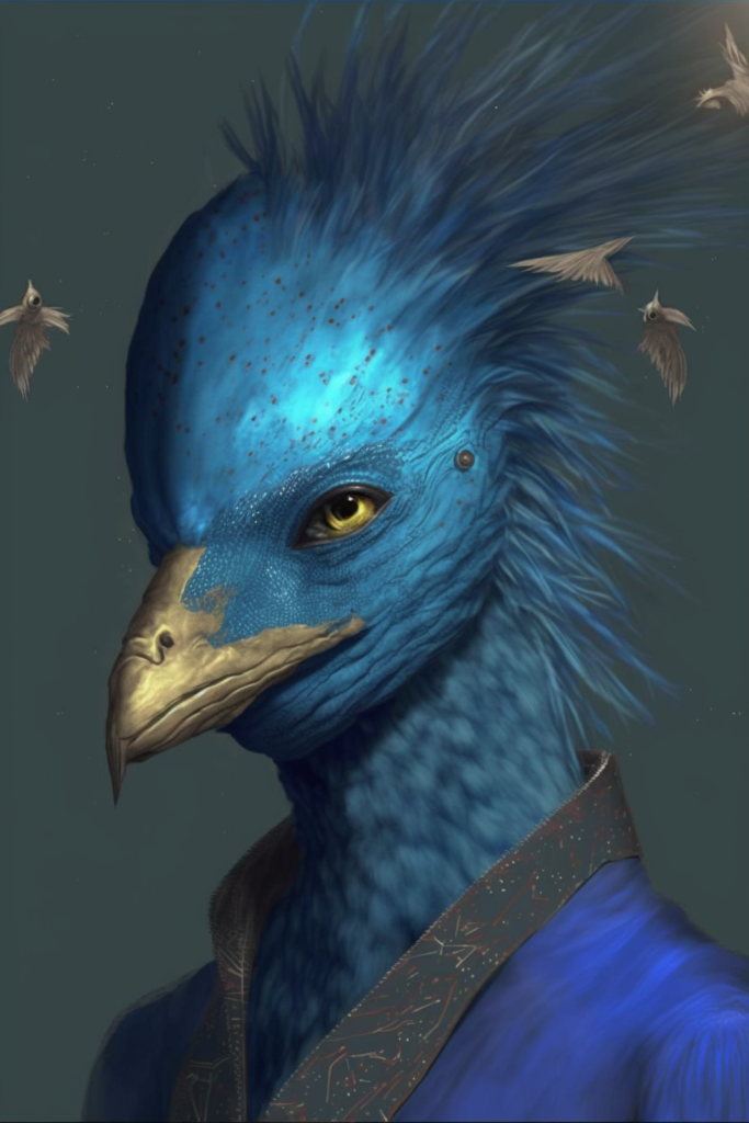 Eles possuem plumagem azul-celeste, asas alongadas e uma estatura elegante. Seus olhos irradiam uma luz intensa e sábia, refletindo a profundidade de sua compreensão do universo.